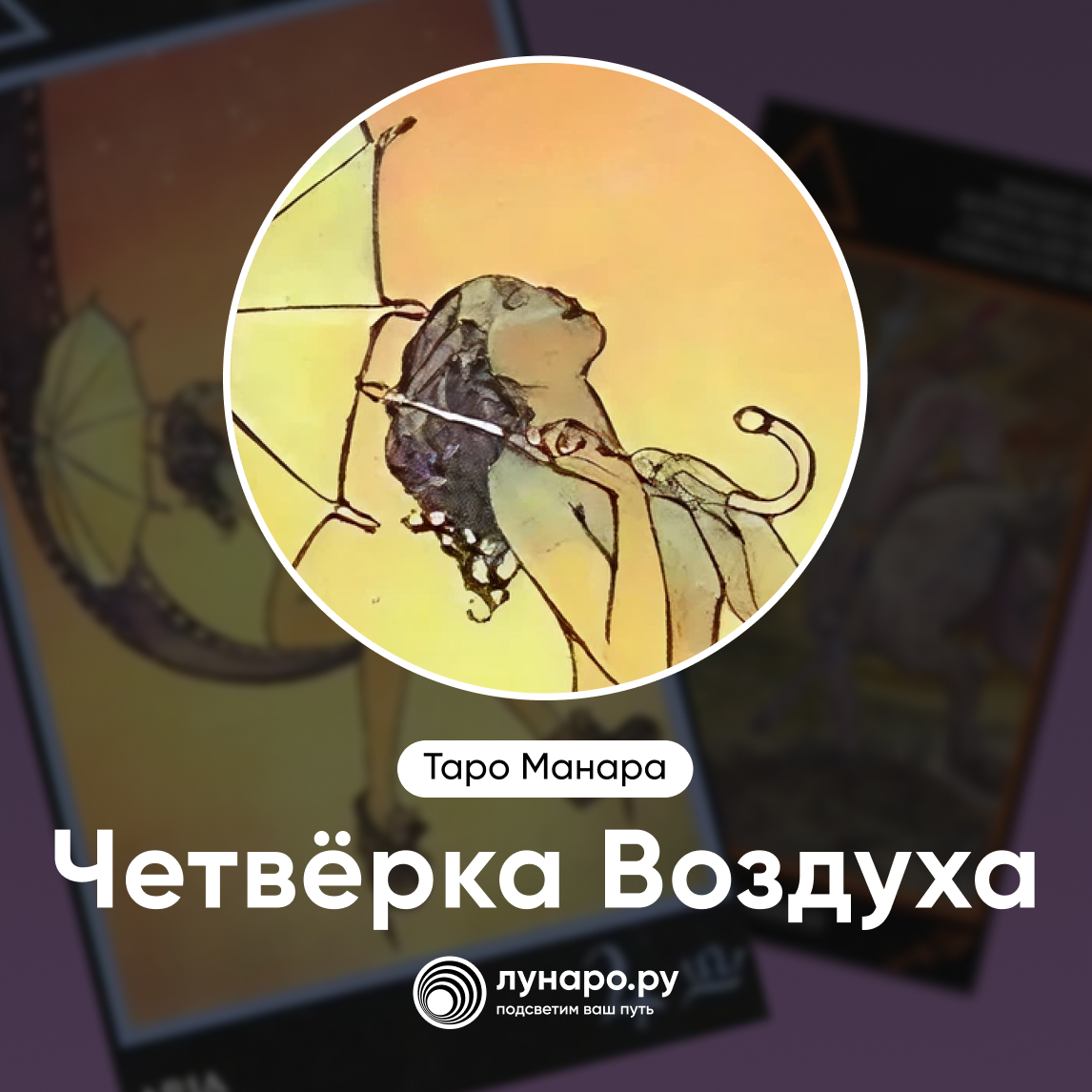 - Четвёрка Воздуха Таро Манара — строительство воздушного замка в поиске новых идеалов. Оторванность от реальности и уход от решения существующих проблем. Жизнь в наивных мечтах и идеализации, где нет конфликтов.