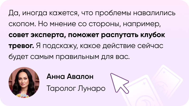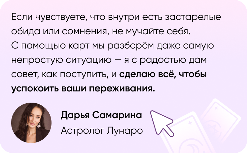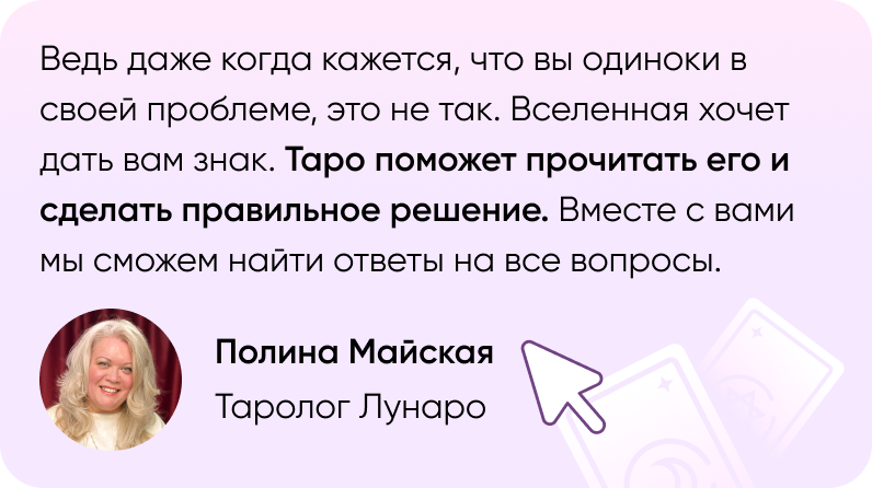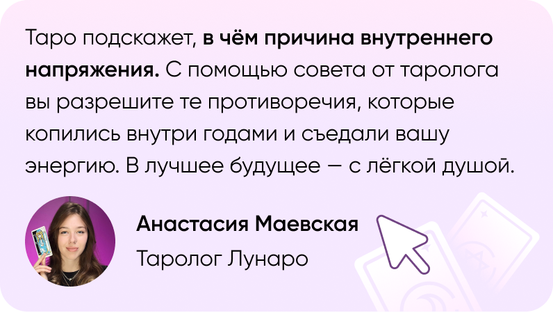 Мы рядом, когда нужна поддержка и ясность. Таро откроет инсайты из пространства, что-то, что вам давно нужно было услышать. А таролог расскажет, что это значит и как вам исправить ситуацию. Вы и таролог — одна команда.