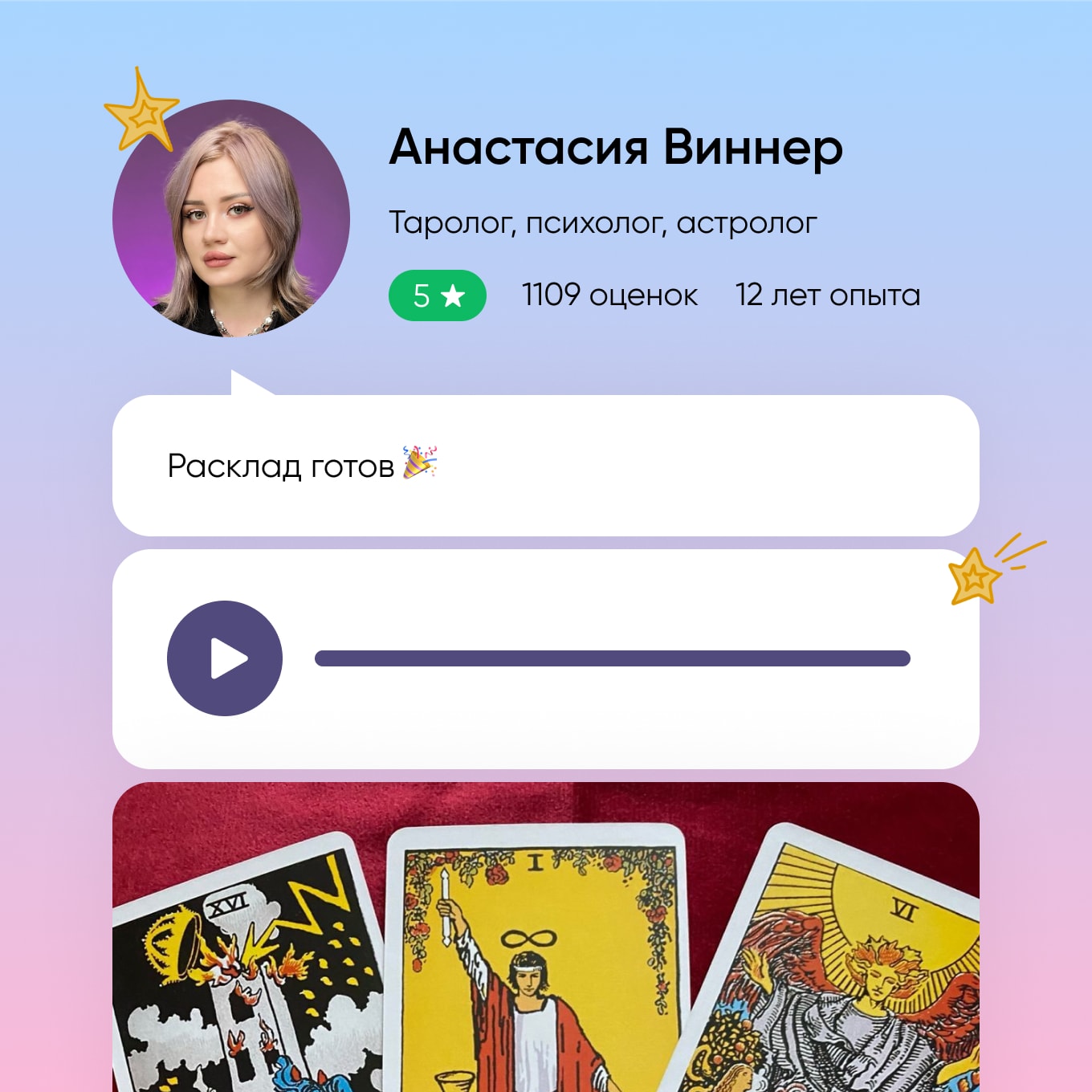 - В течение часа таролог отправит вам фото расклада и его подробное объяснение в аудио-сообщении