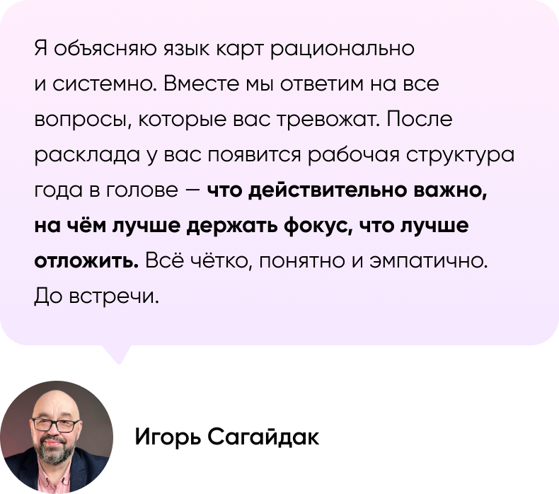 60 минут полного внимания от Игоря. Вам не понадобится ждать, пока таролог освободится, — и не придётся волноваться, что на балансе закончатся средства. - Запись на память
