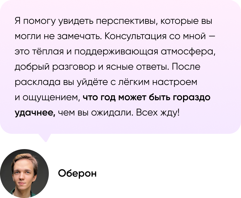 60 минут полного внимания от Оберона. Вам не понадобится ждать, пока таролог освободится, — и не придётся волноваться, что на балансе закончатся средства. - Запись на память