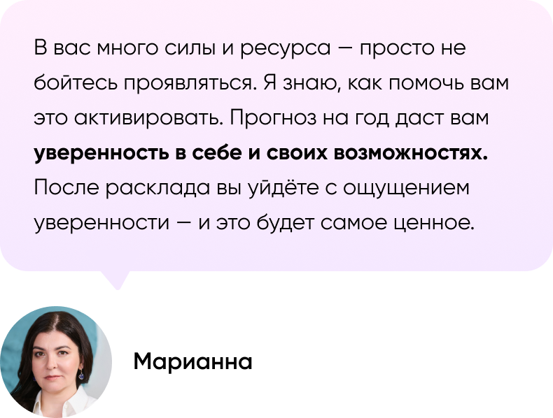 60 минут полного внимания от Марианны. Вам не понадобится ждать, пока таролог освободится, — и не придётся волноваться, что на балансе закончатся средства. - Запись на память