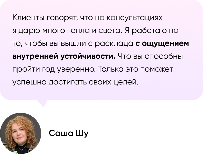 Я никогда не думала, что карты могут быть такими точными. Консультация помогла определиться с приоритетами и планом на год. Строю бизнес, который запустила по совету карт. Пока полёт отличный