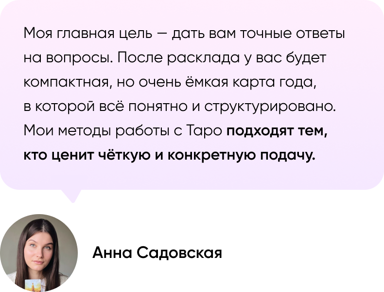 Я никогда не думала, что карты могут быть такими точными. Консультация помогла определиться с приоритетами и планом на год. Строю бизнес, который запустила по совету карт. Пока полёт отличный
