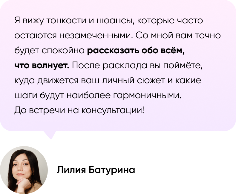 60 минут полного внимания от Лилии. Вам не понадобится ждать, пока таролог освободится, — и не придётся волноваться, что на балансе закончатся средства. - Запись на память